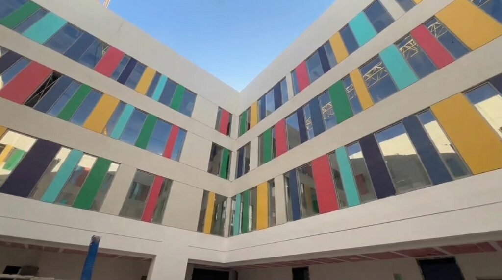 تنبثق فلسفة تصميم مجمعات مساكن الروضة من التكامل مع الهوية الثقافية لمشروع “مساكن الروضة” الأم، حيث يمزج التصميم بين الخطوط العصرية الجريئة والمتطلبات الوظيفية للمباني التعليمية. تم التركيز على خلق فراغات واسعة تسمح بدخول الإضاءة الطبيعية والتهوية، مع استخدام ألوان وتصاميم تحفز على التعلم والابتكار، مما يجعل من المدرسة مكاناً تهنأ فيه العقول بالمعرفة، تماماً كما تهنأ الأسر بالحياة في مساكن الروضة.